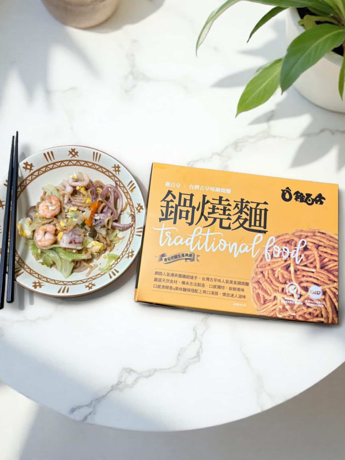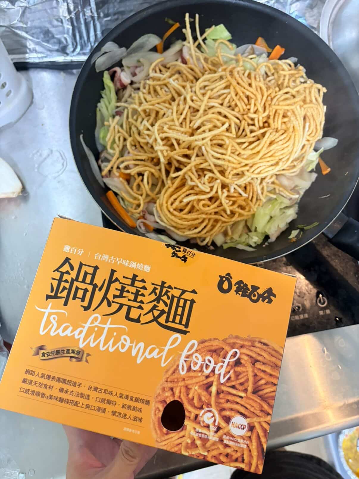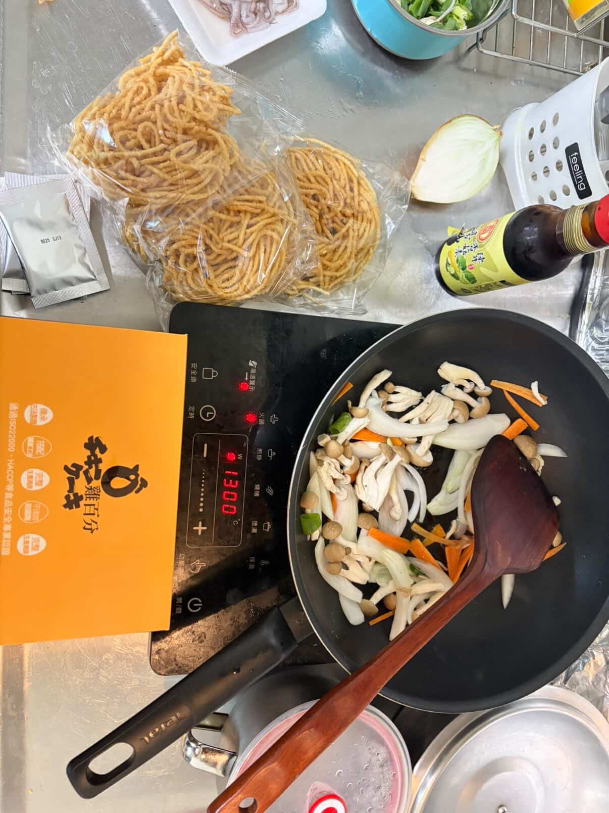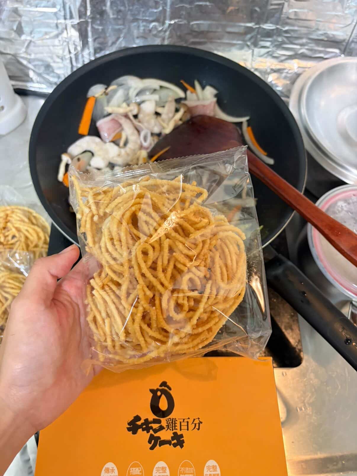 先用蒜末和洋蔥紅蘿蔔絲爆香,再加入自己喜歡的菜跟海鮮,接著放入雞百分的高品質海鮮粉包拌炒。最後,放入重頭戲——那捲吸飽精華的意麵。