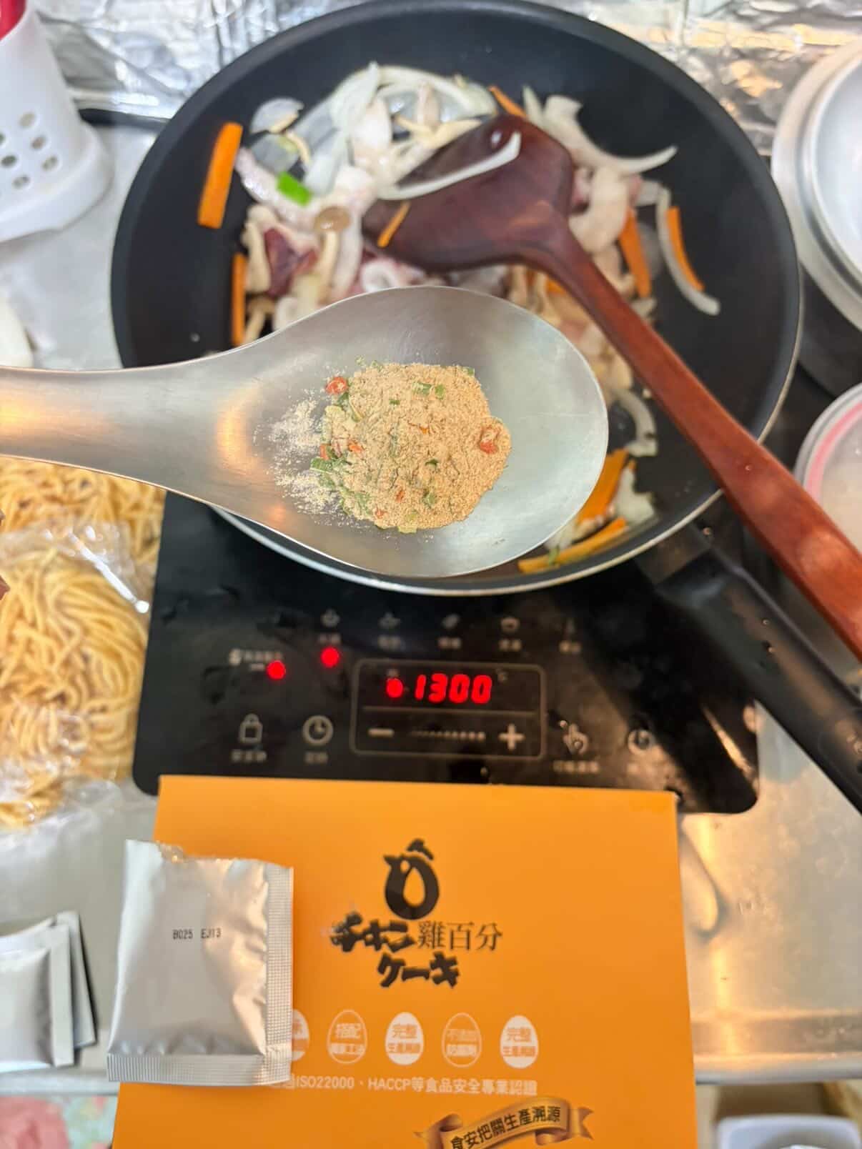先用蒜末和洋蔥紅蘿蔔絲爆香,再加入自己喜歡的菜跟海鮮,接著放入雞百分的高品質海鮮粉包拌炒。最後,放入重頭戲——那捲吸飽精華的意麵。