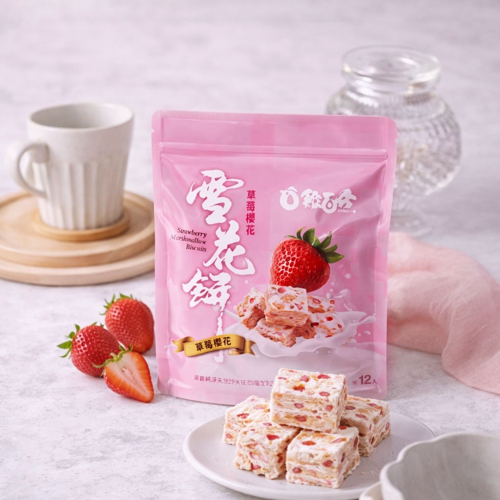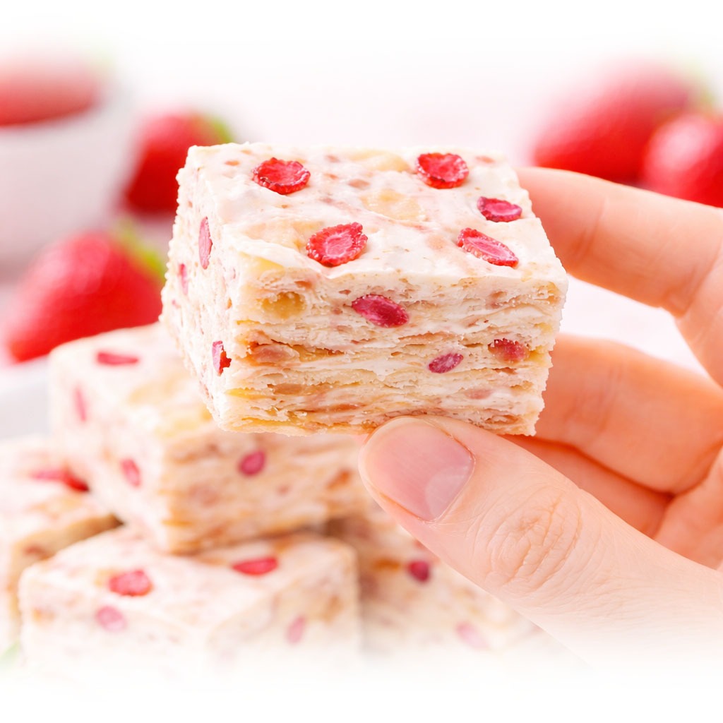 ◆ 原料:餅乾(麵粉、砂糖、植物油、鹽、雞蛋、奶粉、膨脹劑、大豆卵磷脂、β-胡蘿蔔素、香料)、麥芽糖、草莓乾(草莓、砂糖)、無水奶油、草莓果汁粉(濃縮草莓汁、麥芽糊精、樹薯澱粉、紅甜菜汁、檸檬酸、香料)、水、葡萄糖、加糖全脂煉乳、明膠